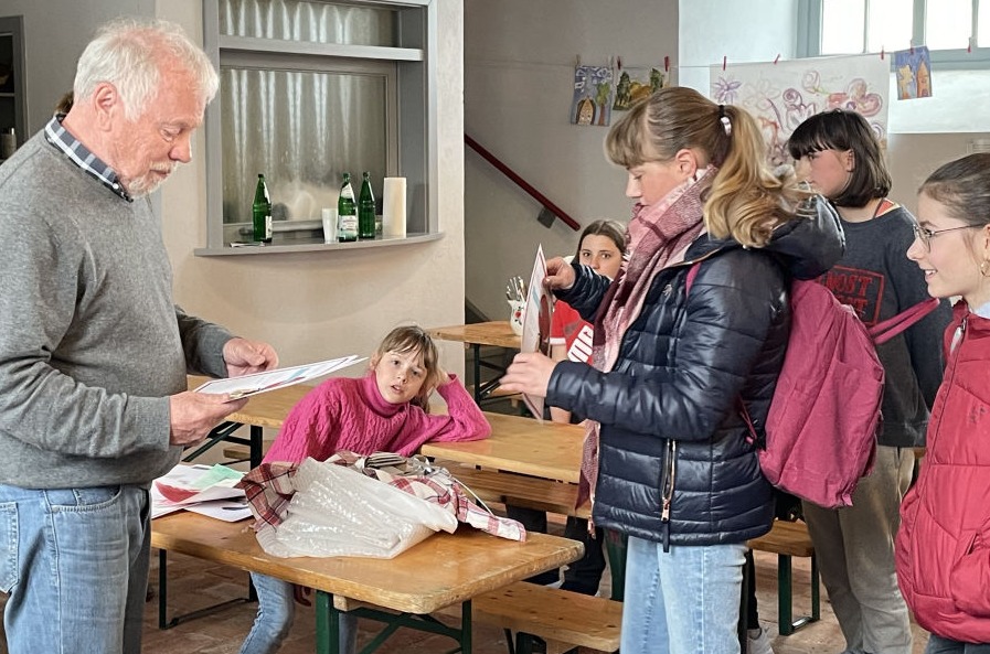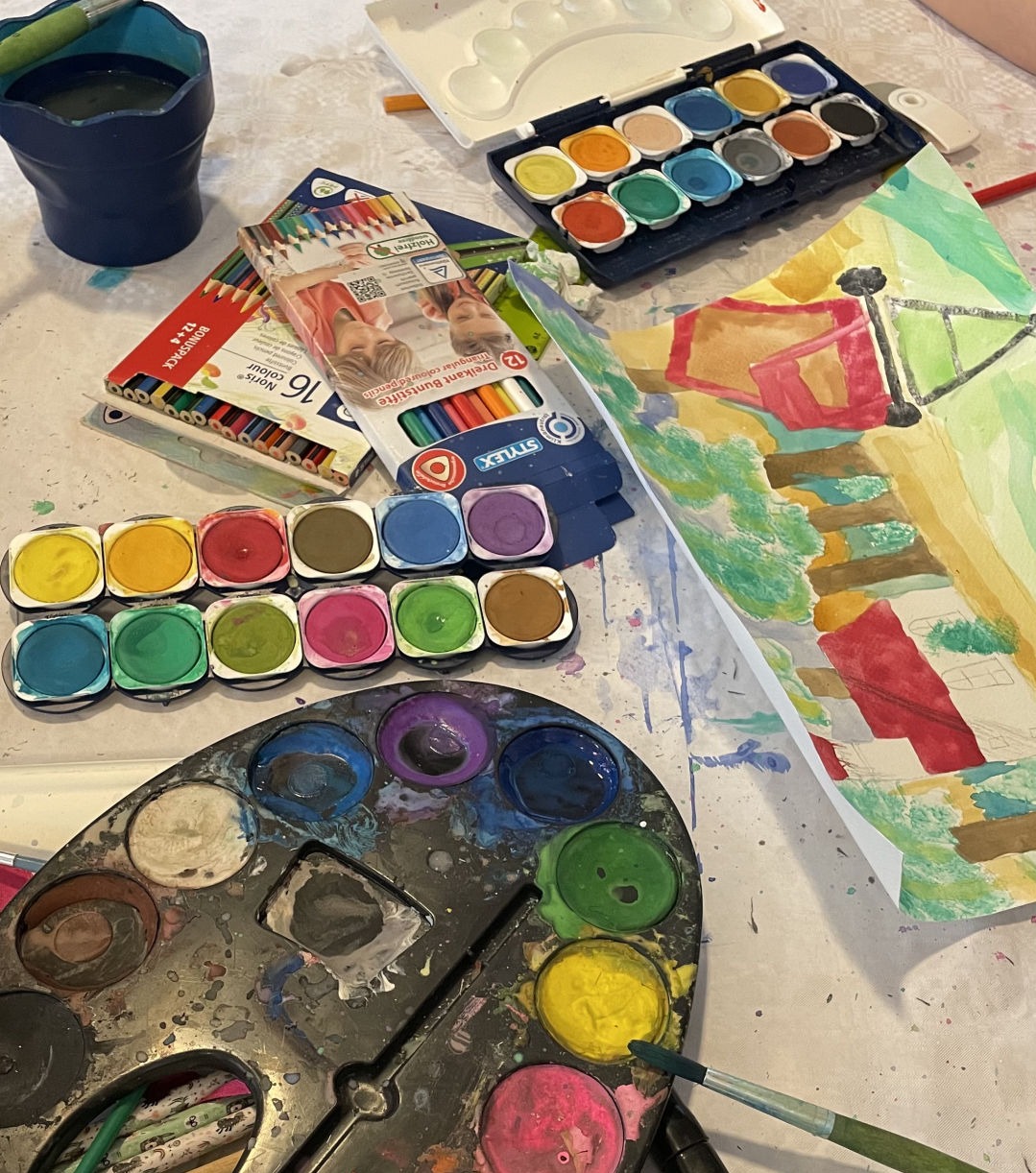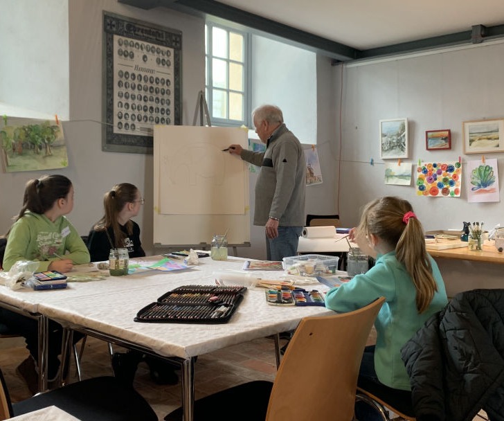 Die Kinder wurden in die Technik des Aquarellierens eingeführt und mit den notwendigen Farben und Pinseln vertraut gemacht. Zum Teil musste auch der traditionelle Deckfarbkasten herhalten, der dem Anliegen keinen Abruch machte.