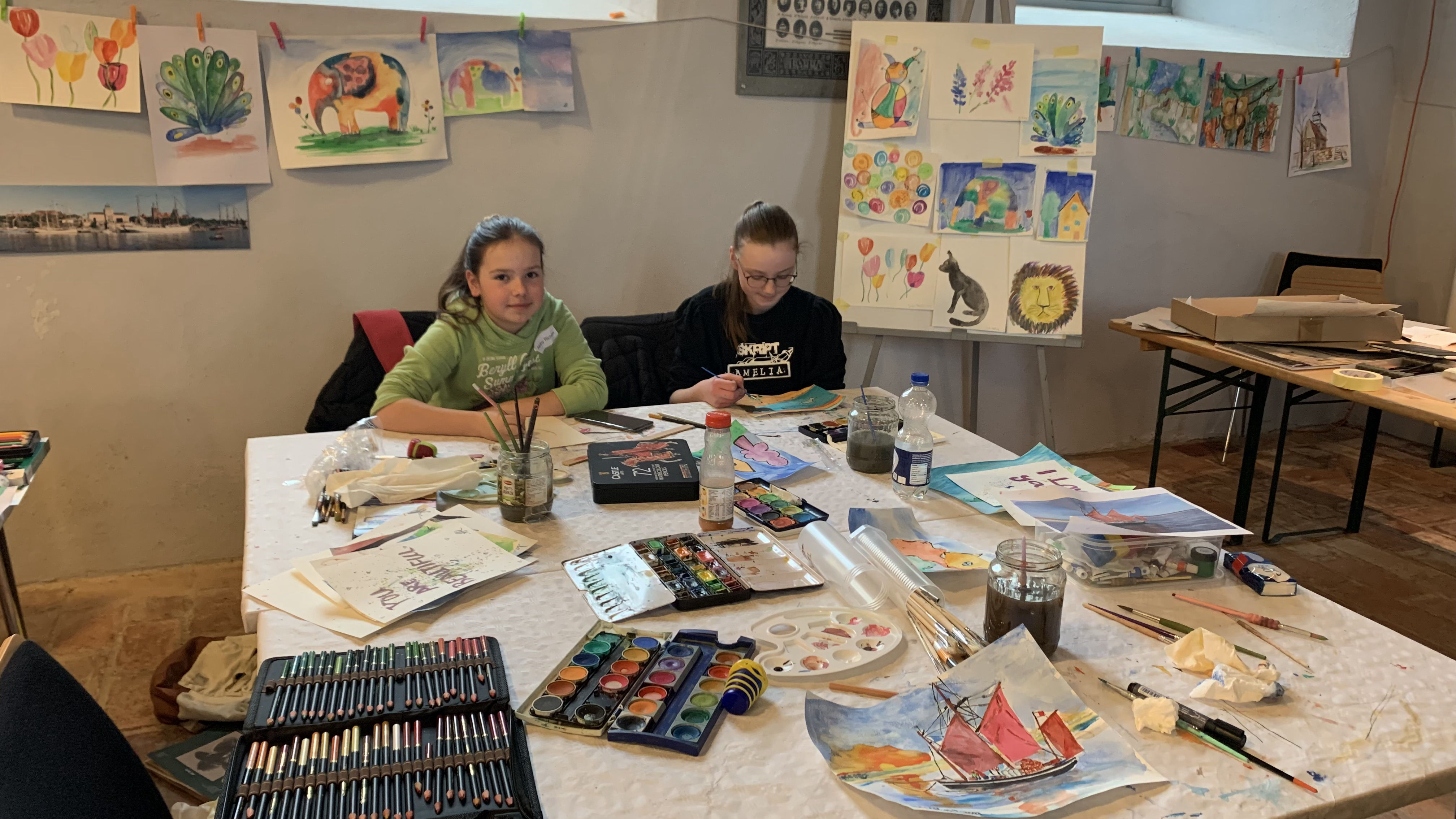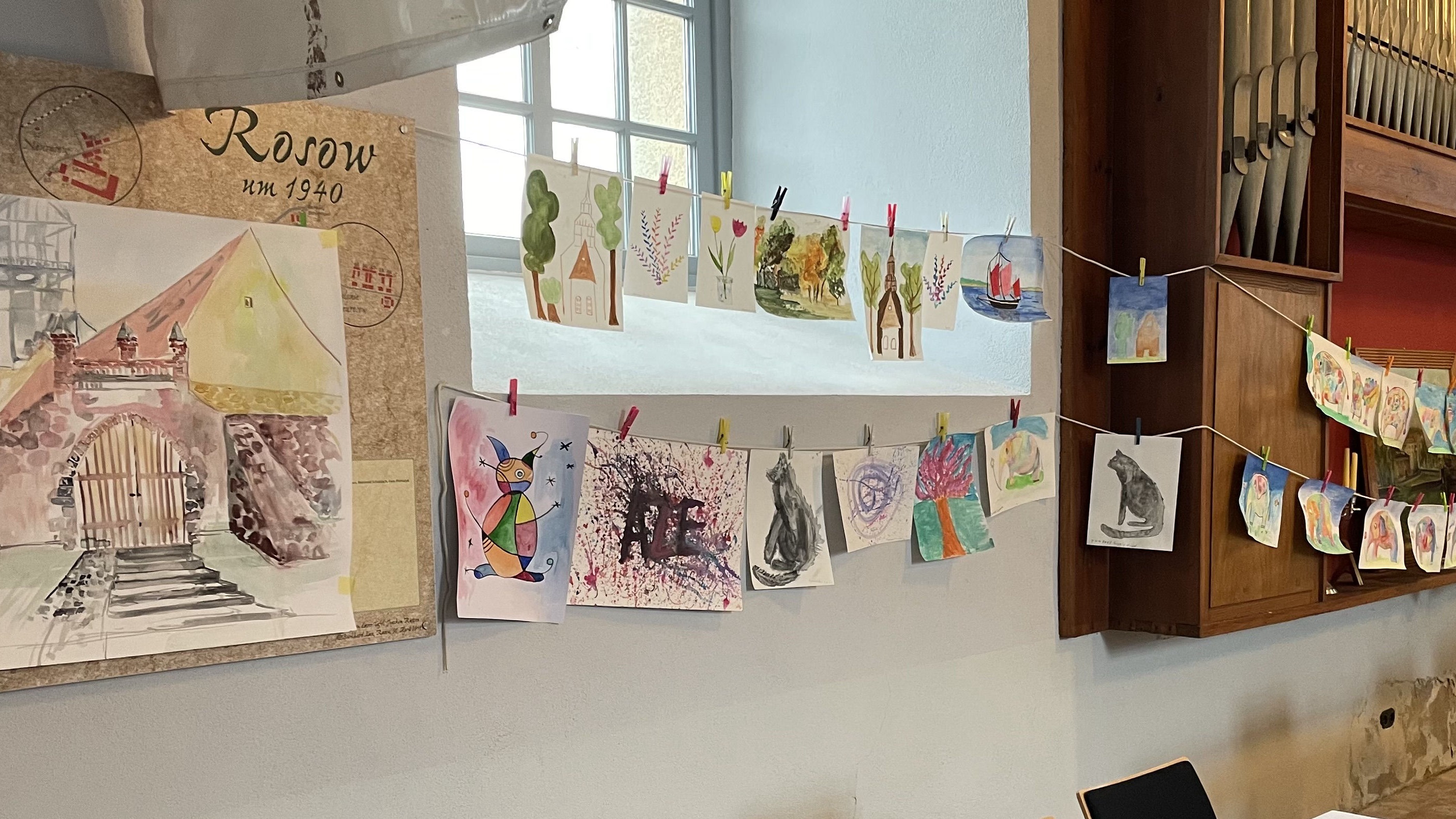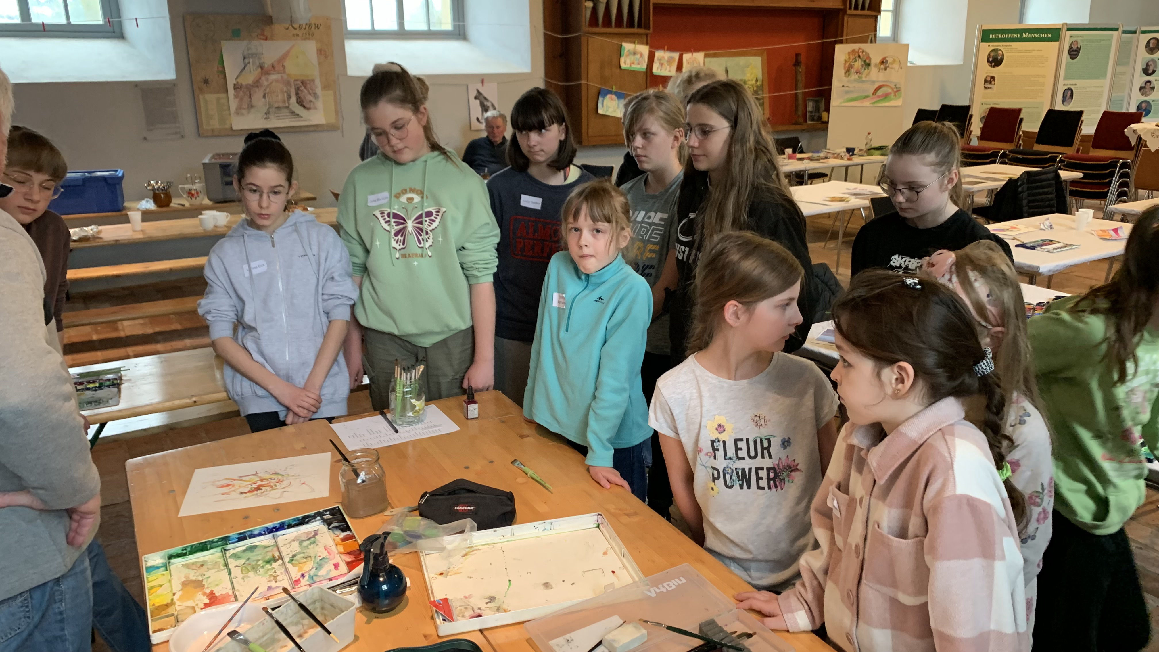 Vierzehn Kinder aus den Gemeinden zwischen Gartz/Oder und Rosow trafen sich zu einem Workshop zur Aquarellmalerei in der Gedächtniskirche Rosow. Es war eine Gruppe von Mädchen, die genau der Zahl von Teilnehmern entsprach, wie es sich der Leiter der Kurses vorgestellt hatte. Die sehr interessierten Kinder, die zwischen 8 und 14 Jahre alt sind, zeigten am Samstag von 10 bis 16 Uhr größte Ausdauer und hohe Konzentration. Bei guter Laune war auch am Sonntag die Motivation uneingeschränkt, alle kamen um 10 Uhr wieder und setzten bis 13 Uhr ihre Arbeiten fort.